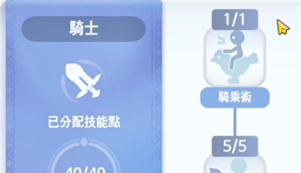 接下来是技能,首先第一个点的是骑乘,它能让骑士可以乘坐大嘴鸟作为坐骑,同时可以让玩家的负重增加。这技能只有1级,所以为优先点。骑兵修炼,此技能是可以增加玩家们使用大嘴鸟时的移动速度。满级的话可以增加40%的移动力,这个速度的数值已经很高了。玩家们完全可以去点满。