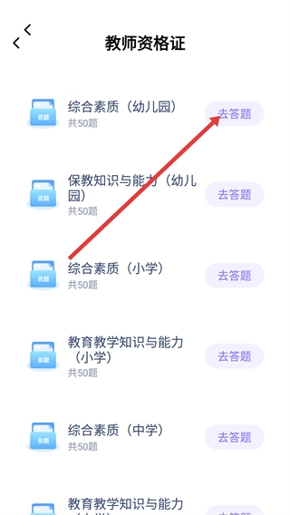 2、进入【教师资格证】页面后,找到【综合素质(幼儿园)】右侧的【去答题】按钮,点击即可进入该科目的答题环节。