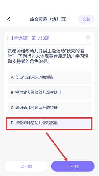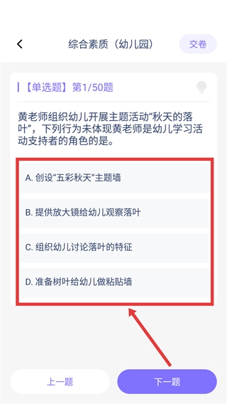3、在【综合素质(幼儿园)】答题页,查看单选题题干及选项,选择对应答案后,可点击【下一题】继续作答。