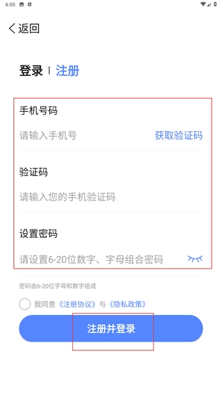 4、切换至注册页,输入【手机号码】获取验证码,填入后设置密码,勾选协议点击【注册并登录】完成账号创建。