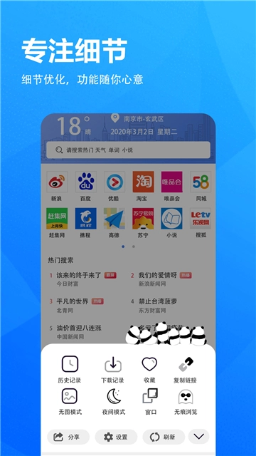 支持主流各大搜索引擎,海量新闻头条、免费小说影视、网址导航,满足你90%的手机上网需求!