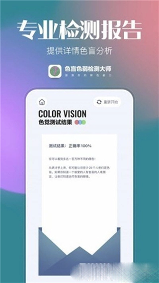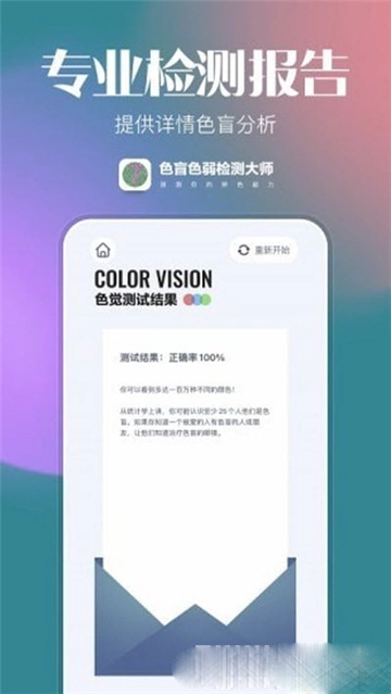2.专项训练,针对红色色盲、绿色盲、蓝紫色盲、色弱提供多种图案一遍测试和训练。