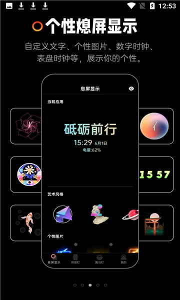 3、多样化熄屏显示:提供多种熄屏显示效果,包括艺术风格、个性图片、数字时钟等。