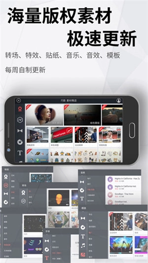 特效、贴纸、音效、转场素材每月更新,更有iKON、BIGBANG、SECHSKIES、会说话的汤姆猫家族、B.Duck小黄鸭、蛋黄哥授权视频素材。