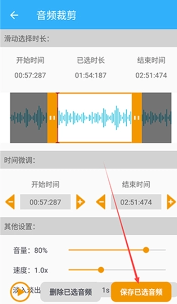 3、拖动两边的进度条选中需要的音频部分,或在下方进行微调
