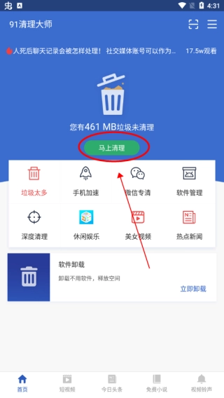 1、91打开91清理大师,进入软件界面后,点击“马上清理”按钮。