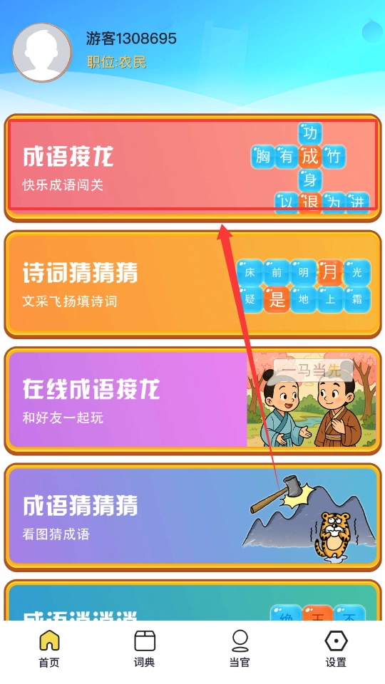 2、用户在游戏中不仅能巩固成语记忆,还能通过互动方式理解词义和用法。