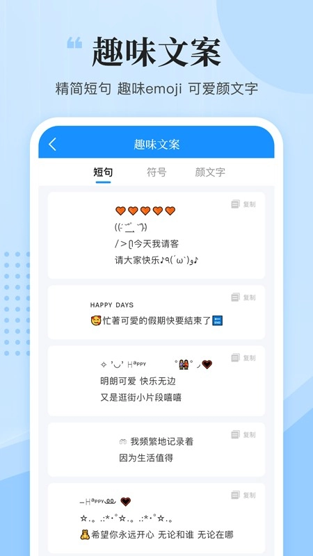 文案君是一款专业的文案编辑工具,能让你更便捷地进行文案查询,平台提供丰富多样的文案内容,助力用户高效在线创作。这里有超多不同类型的文案素材可供挑选,你可以放心在线选择使用。同时,还能轻松查询名人语录,为你带来专业的文案创作服务,让你安心进行文案写作,享受优质的创作体验,自由挑选心仪的文案。