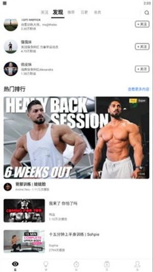 1、启动软件后,点击“发现”板块,既能浏览当下热门的健身视频排行榜,也能关注人气较高的健身网红。