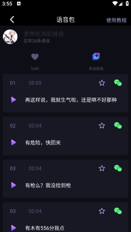 海量语音包资源:涵盖热门游戏(如吃鸡、王者荣耀)和日常聊天场景的真人语音包,像超嗲小萝莉、温柔小姐姐、温柔小哥哥等语音包,增加互动乐趣。