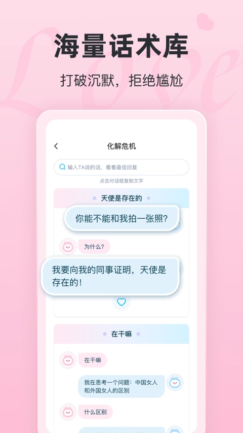 1、拥有超过 100 万条的聊天话术,涵盖各种恋爱场景和情感表达方式,无论是初次相识时的破冰,还是深入交往后的暖心交流等,都能满足用户在不同阶段的聊天需求。