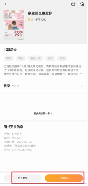 2、点击进入书籍详情界面,你可以直接点击免费阅读或者加入书架