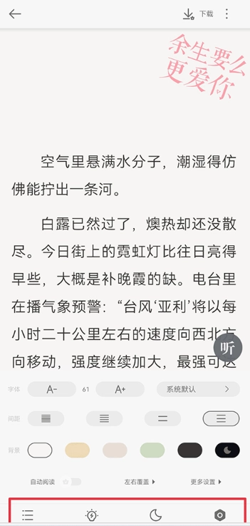 3、就可以正常阅读内容啦,点击屏幕还可呼出菜单,你可以查看目录、调正亮度、切换日/夜间模式、设置自动阅读、字体等等