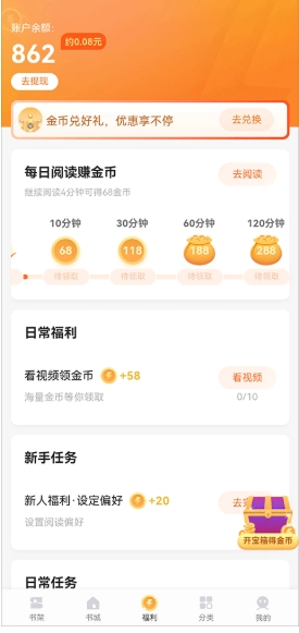 4、另外在福利界面中,阅读书籍后可以获得金币,当金币达到一元金额时就可以选择提现了