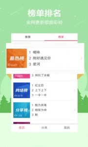 1、紧跟当下潮流趋势,汇集了当前热门的铃声资源,包括手机铃声、彩铃、歌曲铃声、流行金曲、影视热曲、动漫游戏配乐、短信闹铃、DJ舞曲、搞笑另类音频、网络神曲以及网友上传的优质铃声精选;各类风格类型一应俱全,你可以随心挑选自己喜爱的铃声、手机铃声或彩铃。