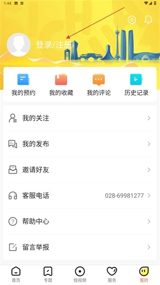 2、进入个人中心的界面内,点击上方登录/注册的区域位置。