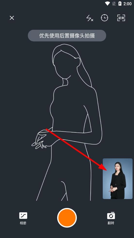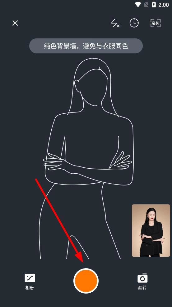 4、在依据选定的姿势线条图调整好自身姿势后,点击界面下方的橙色拍照按钮来完成照片拍摄。