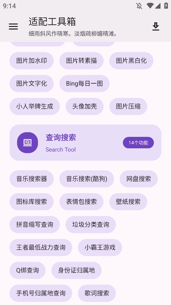 适配工具箱App是一款功能免费又实用的手机工具应用,它的界面设计简洁明了,同时功能十分丰富且全面,包含了生活日常所需的各类工具、系统操作相关工具、资源提取工具以及文字处理类工具等多种类型。无论是哪一种类别的手机工具,用户都能免费使用,所有全面的功能都可以根据自己的需求随意体验,真正实现了一站式解决大家在日常生活中遇到的各种工具需求,赶紧来使用吧!