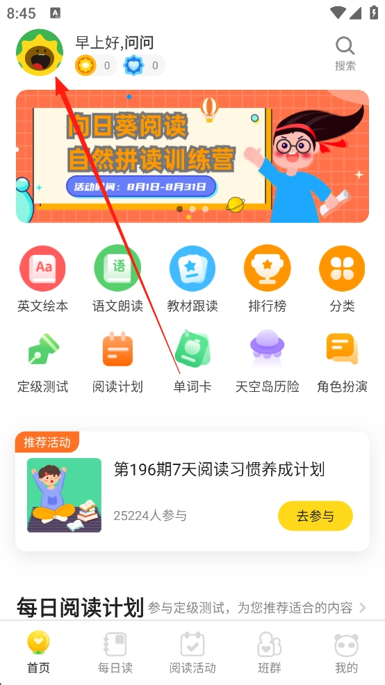 1、进入向日葵阅读后,点击下方的“班群”,在上方的输入栏中将老师提供的班群码输入进去,点击右侧“加入班群”,就能加入班级了