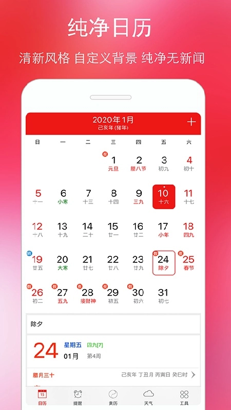 日历设计简约清爽,没有垃圾新闻和冗余广告的干扰。用户可以自定义日历背景,让日历真正属于自己,从视觉上就能感受到精美日历带来的愉悦体验。