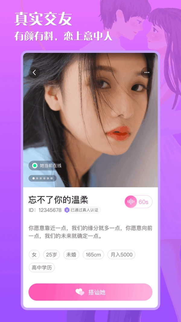 1、平台用户均为真实用户,配备严格的审核机制,杜绝机器人账号,让您安心在线交友。