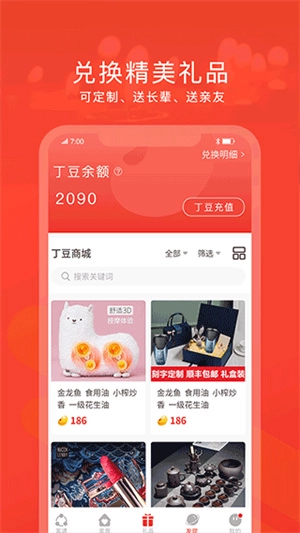 3、应用内也为给位用户精心准备了各种礼品,都是可以免费兑换的,是通过丁豆兑换,丁豆可以做任务免费获得。