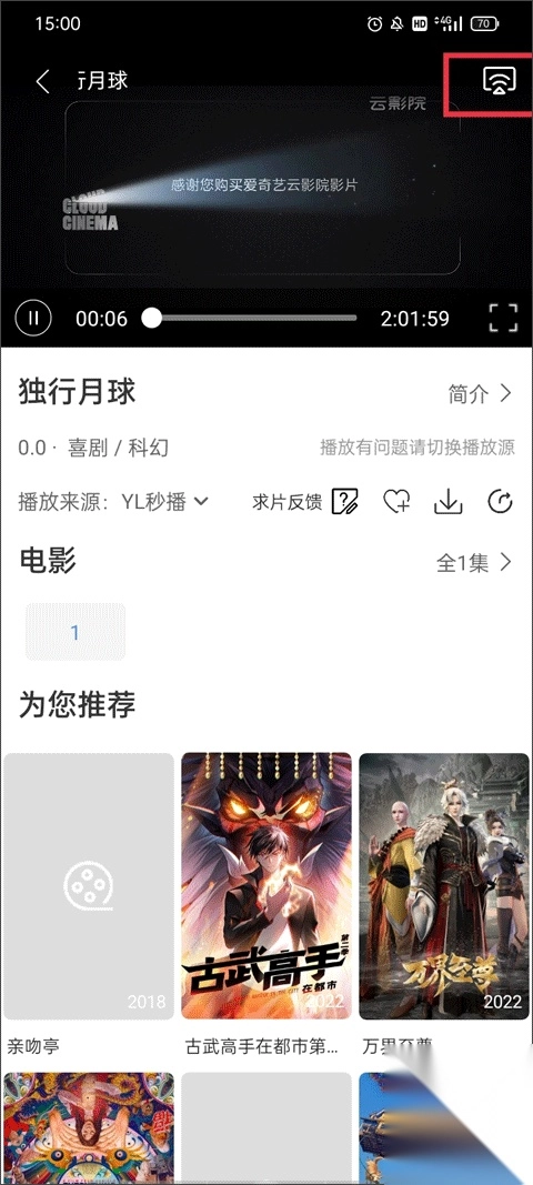 2、点击上方的视频播放区域,右上角会出现一个投屏图标按钮,点击它;