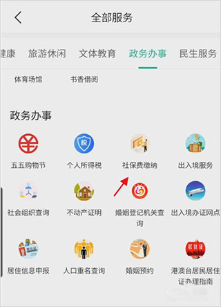 5、进入更多服务,找到政务办事,点击下方的社保费缴纳进入;