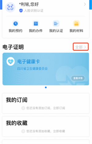 1、首先,认证登陆“天府通办”后,点击“我的”电子证明“全部”进入电子证明页面。