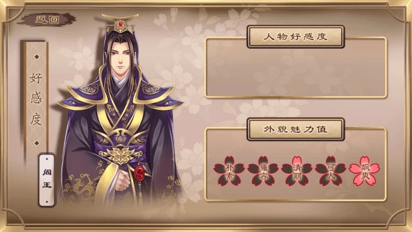 服装上呈现的小花,每件服装单个属性最多有五朵。当某个属性累计达到八朵小花时,对应的好感度(可通过菜单-好感度查看)里的花瓣会增加一瓣,请注意是增加一瓣。所有最佳结局都要求特定属性满花。例如“飒爽满花”,指的是(如下图所示)好感度界面中飒爽对应的那朵花,五片花瓣都处于点亮状态。若要达成最佳结局,基本上所有服装的需求属性都必须达到五朵小花,没有调整的空间。套裙的属性计算方式为:上装属性加下装属性,总计五朵小花。