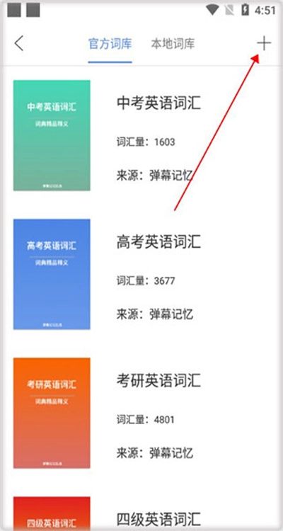 1.进入首界面,你可以在右上角点击加号加入你要学习的词汇级别。