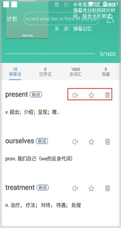 3.在这里每个单词都可以在右边点击喇叭、收藏等操作。