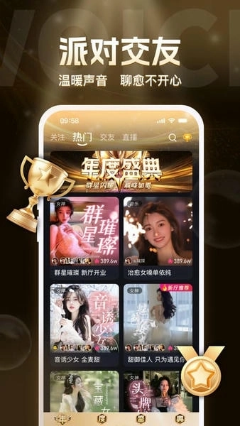 3.语音直播:设有黑房、情感电台、Pia play配音等多元主题直播间,支持多人实时互动交流。