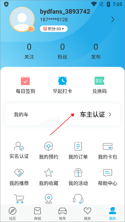 1、打开并登录软件后,进入我的页面中点击【车主认证】