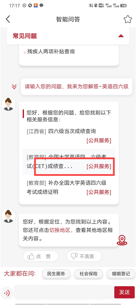 2、输入“英语四六级”这几个字后,系统会自动检索相关关键字,此时我们能看到“全国大学英语四六级成绩查询”的选项,点击其中红色的“公共服务”按钮就能直接进入查询页面。