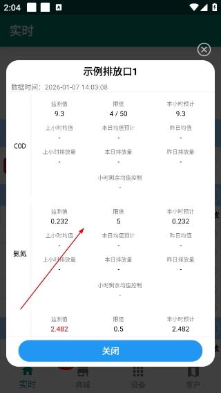 4、进入【示例排放口1】的详情页面,查看包括日均值在内的各项指标监测数据,查看完毕后点击【关闭】按钮,返回至上一级页面。